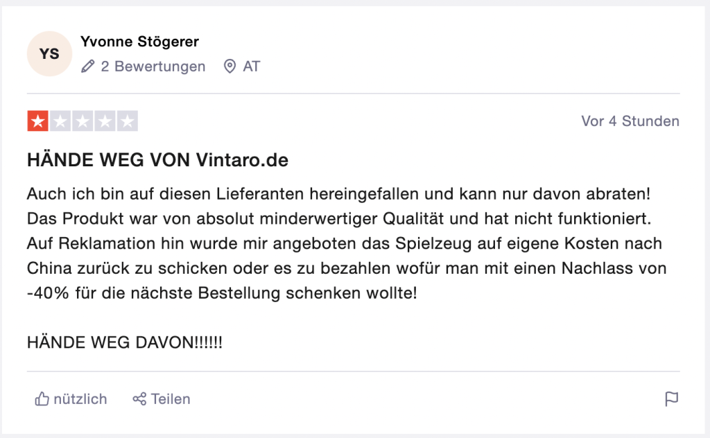Dazu genügt es die aktuell letzte Bewertung zu lesen. Denn die Kundin hat bei Vintaro bestellt und war nicht zufrieden. Als die Kundin das Produkt zurückschicken wollte, hat der Shop der Kundin mitgeteilt, dass Sie die Ware auf eigene Kosten nach China zurückschicken soll. Was eine absolute Frechheit ist. Aber das war noch nicht alles, der Shop wollte nicht mal das Geld zurückerstatten, sondern nur einen -40% Rabatt auf die nächste Bestellung anbieten. Hier der Screenshot: