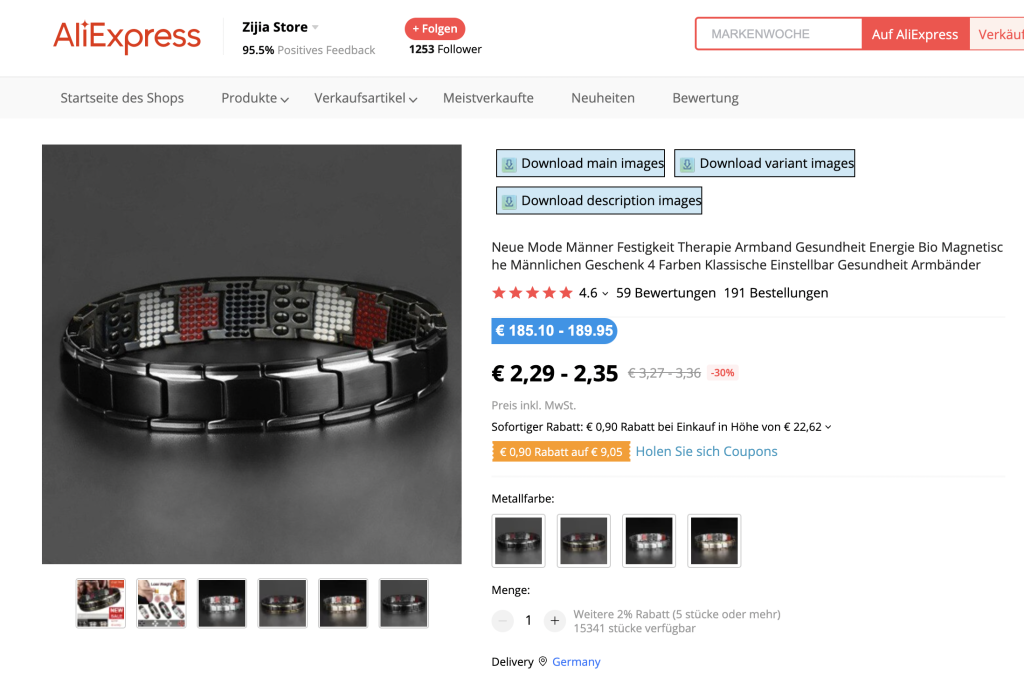 Der Shop wirbt mit einem 1+1 GRATIS Angebot. Jetzt fragen sich wahrscheinlich einige Leser für wieviel Euro bekommt Vintaro denn die Armbänder. Auch diese Frage kann ich Ihnen beantworten. Viele Kettengeschäft-Betreiber bestellen die Produkte für deren Kunden auf AliExpress. Somit habe ich kurz auf AliExpress recherchiert und siehe da: