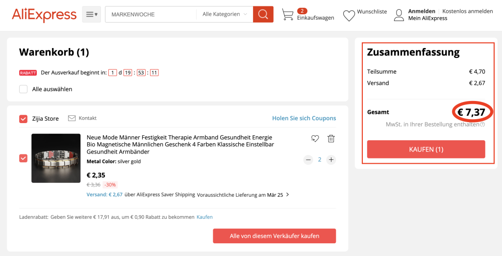 Jetzt mache ich Ihnen mal die Rechnung. Also jemand bestellt das Angebot bei Vintaro für 24,95 €. Somit erhalten Sie insgesamt zwei Armbänder. Das bedeutet, wenn Vintaro zum Beispiel bei dem oberen Lieferant bestellt, zahlen die für zwei Armbänder mit Versand maximal 7,37 €. Siehe Screenshot: