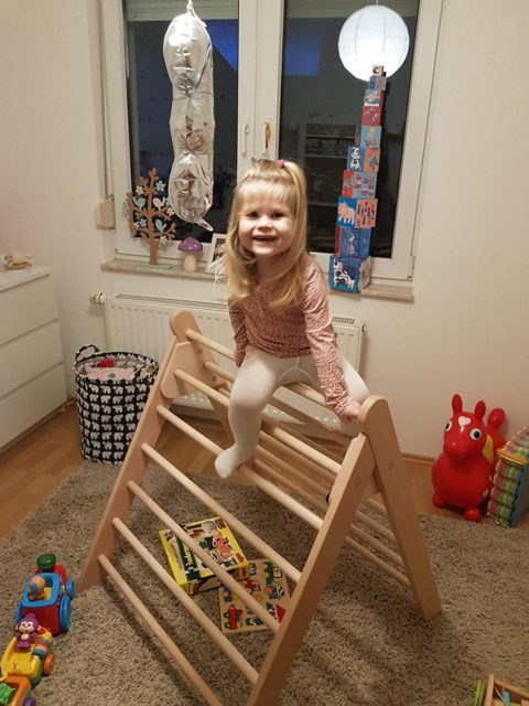 Einfach gesagt, es ist ein Klettergerüst. Während traditionelle Outdoor-Kletterausrüstung mit Schaukeln, Rutsche und Ablage auf das ältere Kind mit bereits entwickelten grobmotorischen Fähigkeiten ausgerichtet ist. Man kann das Pikler-Dreieck als Starter-Kit betrachtet werden. Die wörtlichen Bausteine, die es Ihrem sich entwickelnden Baby ermöglichen, altersgerechte Koordinierungs- und Entwicklungsmeilensteine zu erreichen.