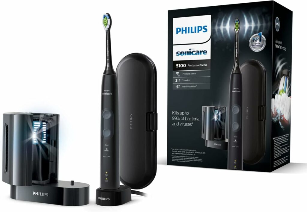 Die Philips Sonicare ProtectiveClean 5100 Elektrische Zahnbürste ist in verschiedenen Einzelhandelsgeschäften sowie online verfügbar. Überprüfe aktuelle Angebote und Verfügbarkeiten, um das beste Angebot zu finden. Im Lieferumfang enthalten sind die Schallzahnbürste, die W2 Optimal White Aufsteckbürste, ein Reiseetui, eine Ladestation und das UV-Reinigungsgerät, alles in elegantem Schwarz. Die Akkulaufzeit beträgt beeindruckende bis zu 2 Wochen.