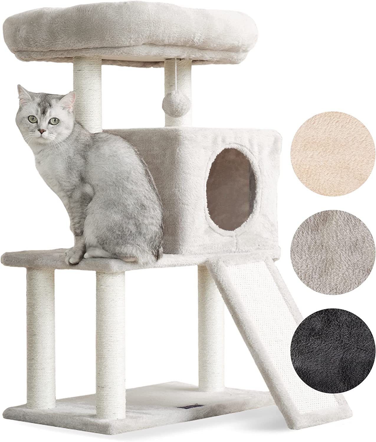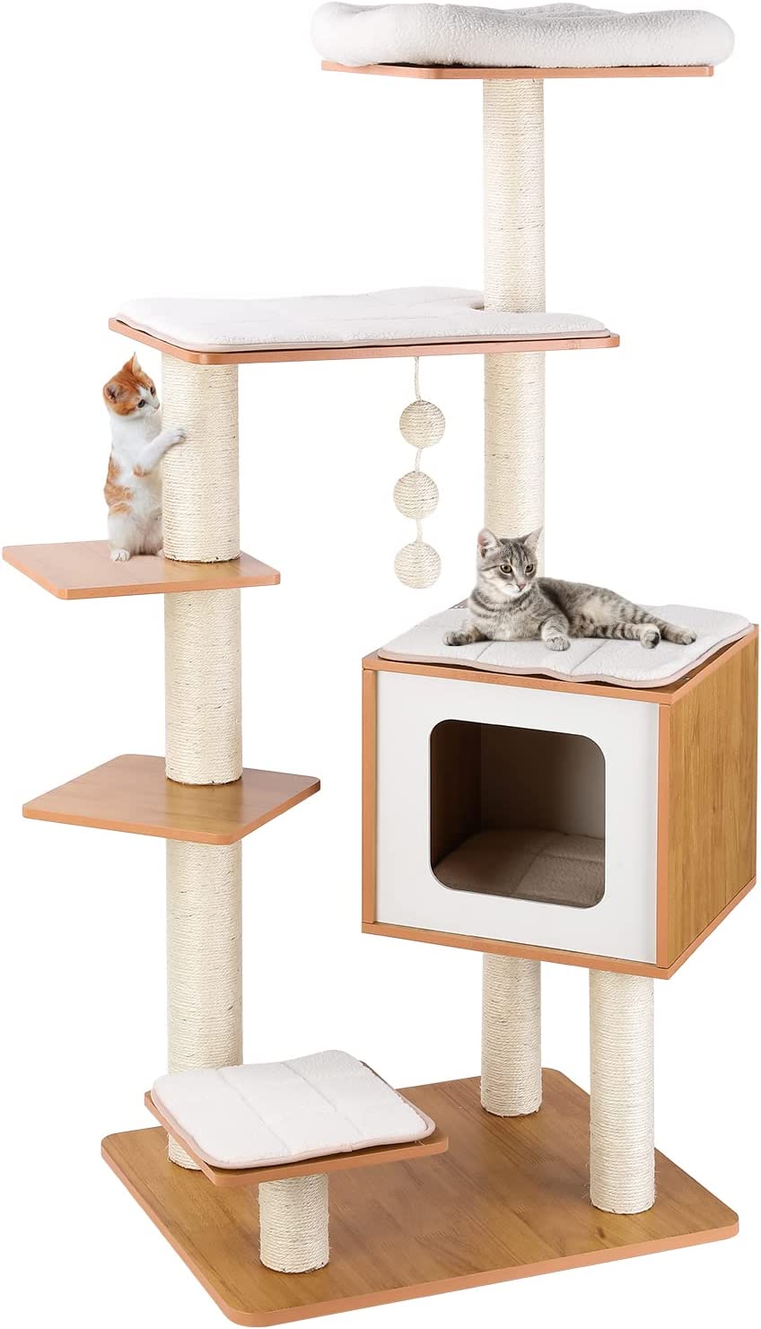 UNSER WARENBERICHT : Nachdem wir den mehrstöckigen Katzenkratzbaum ausgiebig von unseren Katzen testen lassen haben, sind wir von ihren positiven Reaktionen begeistert. Unsere Katzen waren sofort von den zahlreichen Spiel- und Ruheplätzen begeistert. Sie haben die 2 gut gepolsterten Plattformen, die kuscheligen Höhlen, den flauschigen Korb, die Hängematte und die Plüschbälle ausgiebig genutzt.: : Besonders gefallen hat ihnen die Höhe des Kratzbaums. Mit einer Höhe von 206 cm bietet er ihnen die Möglichkeit, auf hohe Plätze zu klettern und die Umgebung zu beobachten. Die kurzen Abstände zwischen den Stufen erleichtern ihnen das Auf- und Absteigen.: : Die Kratzsäulen und die Kratzrampe aus Sisalseil waren ebenfalls ein großer Erfolg. Unsere Katzen haben ihre Krallen ausgiebig an den Kratzflächen geschärft und das Sofa dabei weitestgehend verschont. Die Kratzrampe erwies sich als besonders hilfreich für Kätzchen und ältere Katzen, die beim Hinaufklettern Unterstützung benötigten.: : Die Verarbeitung des Kratzbaums ist robust und stabil. Die Qualitätsspanplatten, die große Basis mit verstärkten Bodenleisten und der mitgelieferte Kippschutz sorgen für Sicherheit und schützen vor unerwünschtem Umkippen.: : Zusätzlich ist der Kratzbaum leicht zu reinigen. Haare, Schmutz und Krümel lassen sich problemlos mit einer Fusselrolle oder einem Staubsauger entfernen.: : Unsere Katzen haben den mehrstöckigen Katzenkratzbaum wirklich genossen und er hat sich als eine großartige Ergänzung für unser Zuhause erwiesen. Wir können ihn ohne Bedenken weiterempfehlen, insbesondere für Haushalte mit mehreren Katzen, die viel Platz und vielseitige Unterhaltungsmöglichkeiten benötigen.: : : Spiel- und Kuschelmöglichkeiten : : Der XXL Katzenbaum bietet Ihren Katzen ein vielfältiges Angebot an Spiel- und Kuschelmöglichkeiten. Mit 2 gut gepolsterten Plattformen, 2 kuscheligen Höhlen, einem flauschigen Korb, einer Hängematte und 2 Plüschbällen ist dieser mehrstöckige Katzenkratzbaum ein wahres Paradies für Ihre Stubentiger. Sie können nach Herzenslust klettern, spielen und entspannen. Die 13 Kratzsäulen und die Kratzrampe aus Sisalseil sorgen dafür, dass die Krallen Ihrer Katzen bestens beschäftigt sind und Ihre Möbel verschont bleiben. : : Zudem ist der Kratzbaum stabil, sicher und bietet Ihren Katzen einen geschützten Platz zum Toben. Dank der einfachen Montage und der leicht zu reinigenden Oberflächen ist dieser Katzenbaum sowohl für Sie als auch für Ihre Katzen eine komfortable und praktische Wahl.: : : Stabilität : : Die Stabilität dieses Katzenkratzbaums ist hervorragend. Hochwertige Materialien und ein verstärkter Sockel sorgen für einen stabilen Halt. Mit dem mitgelieferten Kippschutz kann der Kratzbaum sicher an der Wand befestigt werden. Er ist für bis zu 6 große Katzen geeignet und bietet ihnen eine sichere Spielumgebung.: : : Material : : Der Kratzbaum besteht aus hochwertigen Materialien wie Holzspanplatte, Plüsch und Sisal. Diese Materialien sorgen für Stabilität und Langlebigkeit. Die Holzspanplatten bieten eine solide Basis, während der weiche Plüsch für Komfort und Gemütlichkeit sorgt. Die Kratzsäulen und die Kratzrampe sind aus strapazierfähigem Sisalseil gefertigt, das zum Kratzen und Schärfen der Krallen ideal ist. Insgesamt ist der Kratzbaum leicht zu reinigen und bietet Ihren Katzen einen bequemen und sicheren Spielplatz.: : : Kundenservice : Spiesbuy® ist offensichtlich stark vom eigenen Produkt überzeugt. Deshalb wirbt es sehr offen mit seiner Geld-Zurück-Garantie. Dies haben wir selbstverständlich überprüft und einen benutzten Kratzbaum nach 29 Tagen zurückgesandt. Der Gesamtpreis wurde drei Tage nach Erhalt der Ware zurückerstattet, ohne dass es irgendwelche Probleme gegeben hat. Auch an dieser Stelle gibt es von uns einen Daumen hoch.