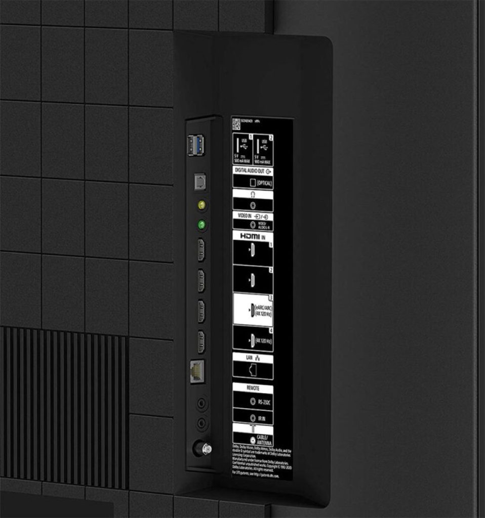 | Häfen | HDMI : 4 (seitlich) [2 x HDMI 2.1, 2 x HDMI 2.0] / eARC-Unterstützung in HDMI 3 USB: 2 (seitlich) [1 x v 2.0, 1 x v 3.0] Digitaler Audioausgang (optisch): 1 (seitlich) RF-Verbindungseingang (Antenne/Kabel): 1 (seitlich) Analoger Audioausgang: 1 (seitlich) Composite-Eingang: 1 (seitlich) Ethernet-Anschluss: 1 (seitlich) RS-232C-Anschluss: 1 (Seite) IR-Eingang : 1 (Seite) |